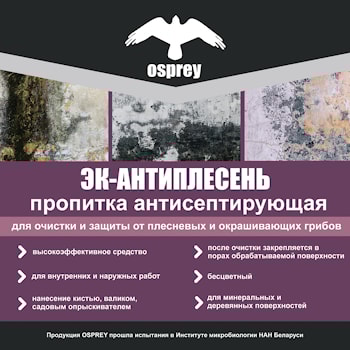 Пропитка антисептик ТУ BY690297859.009-2011 Защита от плесени Любая не обработанная поверхность подвержена поражению грибками и плесенью, что негативно сказывается на эксплуатационных свойствах и снижает срок службы материала. Чтобы избежать такой ...